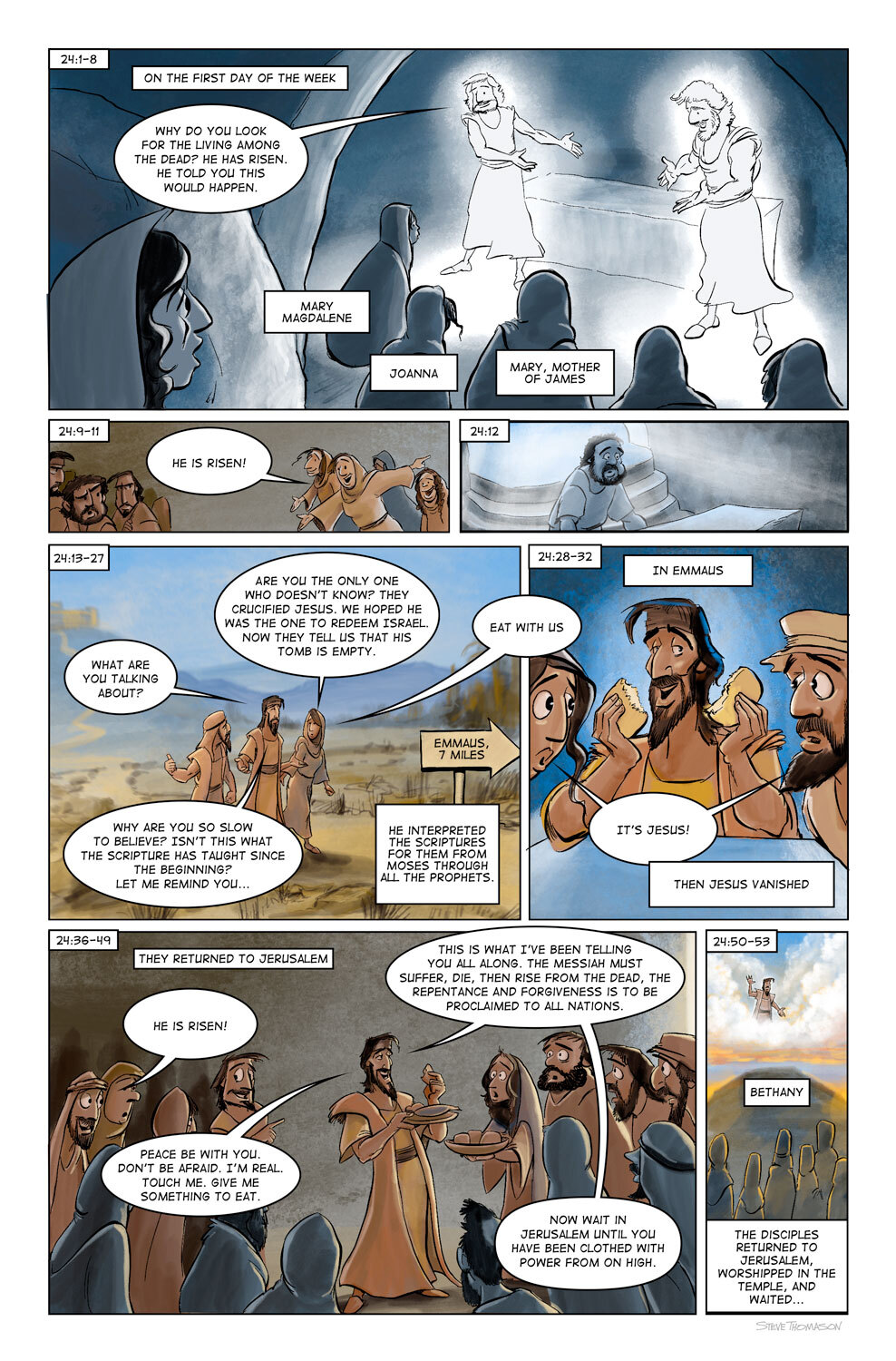 Read through the story of Jesus' final week from all four Gospels in graphic novel style. It is fascinating to compare and contrast how similar each version of the story is to each other and how many subtle differences exist. These illustrations are part of the larger project A Cartoonist's Guide to the Bible