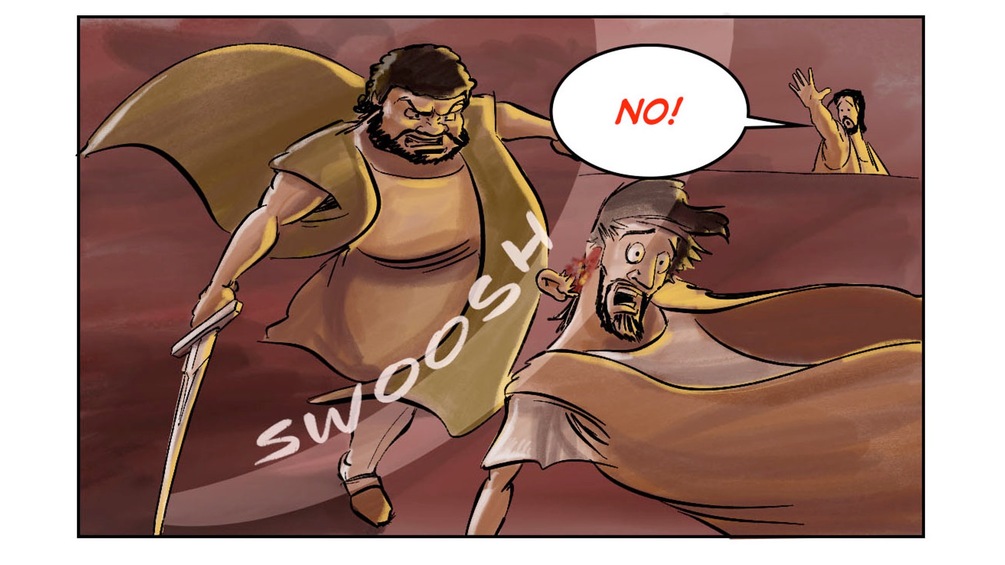 In John 18:1-11 Judas brings soldiers to the garden to arrest Jesus. Peter acts out in violence and Jesus shuts him down.