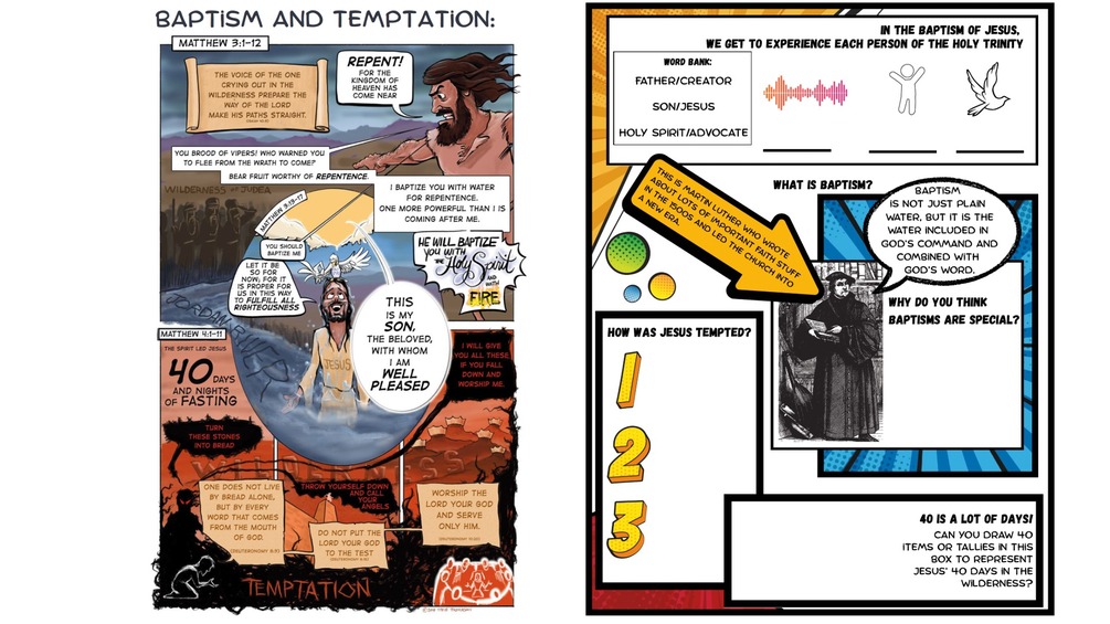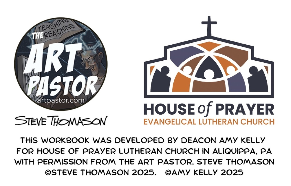 This workbook was created by Deacon Amy Kelly for the House of Prayer Lutheran Church in Aliquippa, PA with permission from The Art Pastor, Steve Thomason (that's me). Amy took each page from A Cartoonist's Guide to Matthew and created a workbook page geared toward children and youth to go along with it.